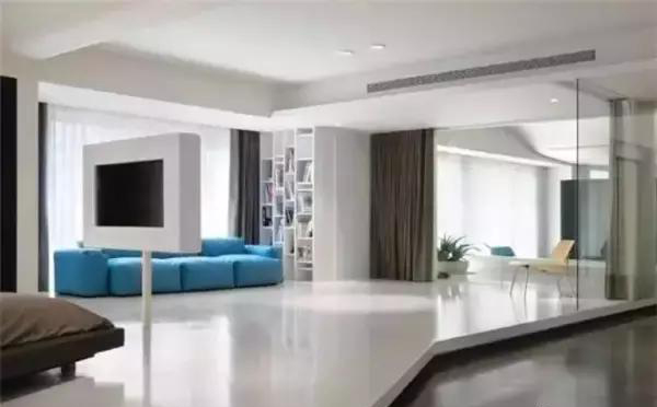 在客廳,一張素色的自流坪地面,搭配素面朝天的白墻、簡簡單單的一張軟沙發(fā),隨便鋪一張地毯,剛?cè)岵辣M顯。